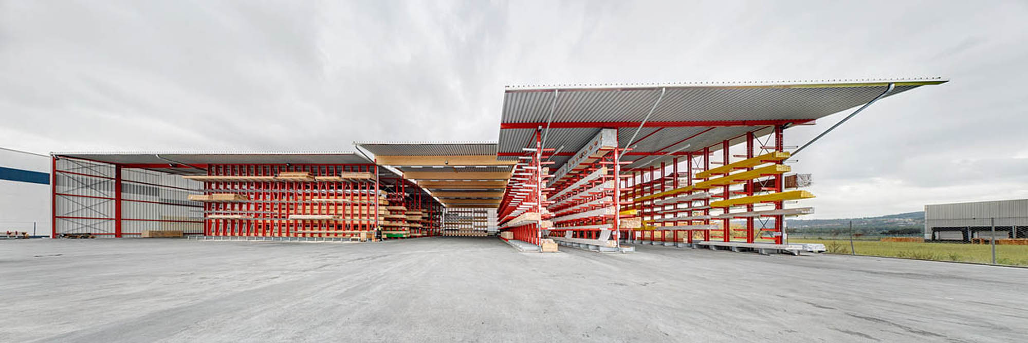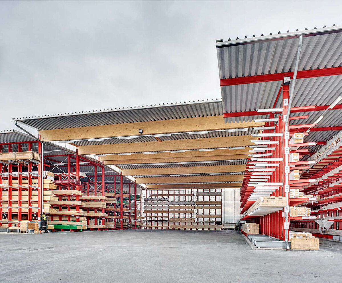Voraussetzung war ein überdachtes Lager mit Schutz vor Regen und gleichzeitiger Belüftungsmöglichkeit für das gelagerte Holz. Zusätzlich sollte ein direkter Zugriff auf die verschiedenen Qualitäten und Abmessungen möglich sein.