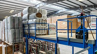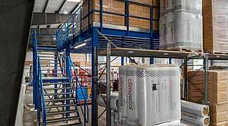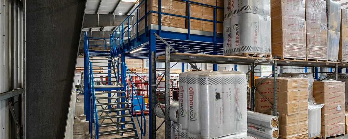 FRIES entschied sich daher, in der vorhandenen Halle eine zweite Ebene einzuziehen und so die Lagerkapazitäten für das Dämmmaterial deutlich zu erweitern – und die Lagerbedingungen zu verbessern. Eine Lagerbühne bietet dafür eine kostengünstige Möglichkeit. Dabei ermöglicht die Flexibilität dieser freistehenden Stahlkonstruktion eine einfache Anpassung an die individuellen Anforderungen vor Ort. Da FRIES fast sein gesamtes Lager mit Regalen von OHRA ausgestattet hat und von der Robustheit der Systeme überzeugt ist, wurde der Kerpener Spezialist für Schwerlast-Regalsysteme auch mit der Installation der Lagerbühne beauftragt.