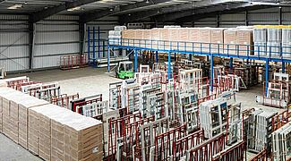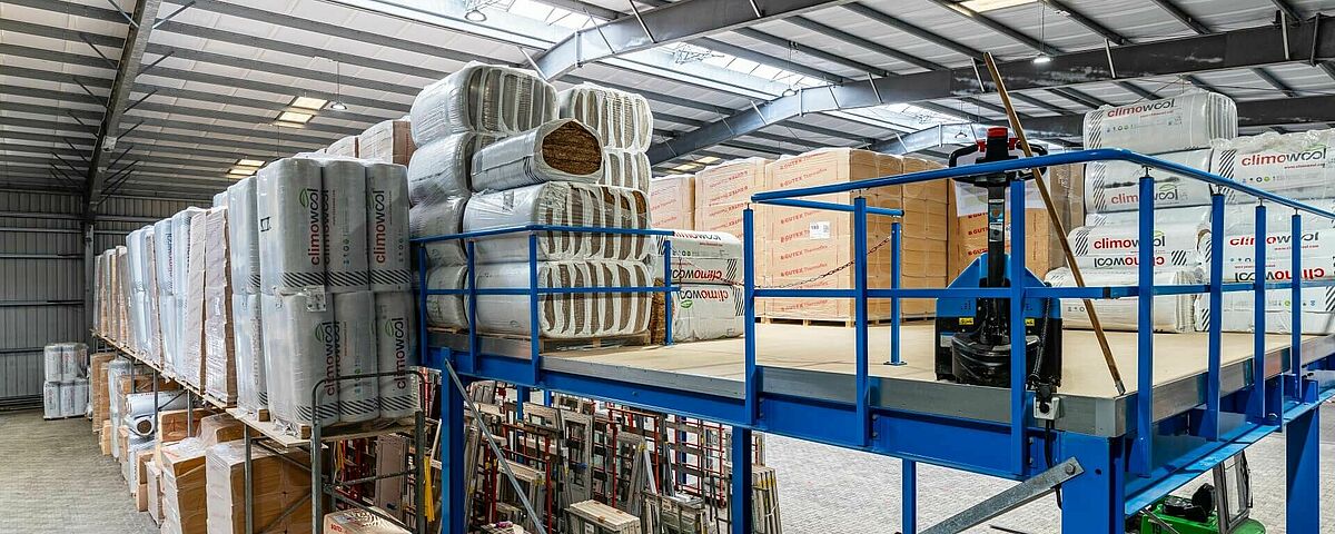 Das Familienunternehmen FRIES, einer der führenden Holz- und Bodenbelagsgroßhändler in Deutschland, hat die Logistik in seiner Kieler Zentrale im wahrsten Sinne des Wortes auf das nächste Level gehoben: Durch den Einbau einer Lagerbühne kann das Unternehmen jetzt die Raumhöhe in der vorhandenen Halle voll ausnutzen. Entstanden ist auf zweiter Ebene in 3,8 Metern Höhe eine Nutzfläche von rund 270 Quadratmetern, auf der sperrige Paletten mit Dämmmaterial im Block gelagert werden. Darunter wurde Platz geschaffen für einen neuen Arbeitsbereich – der sonst notwendige Neubau einer zusätzlichen Halle konnte so vermieden werden.