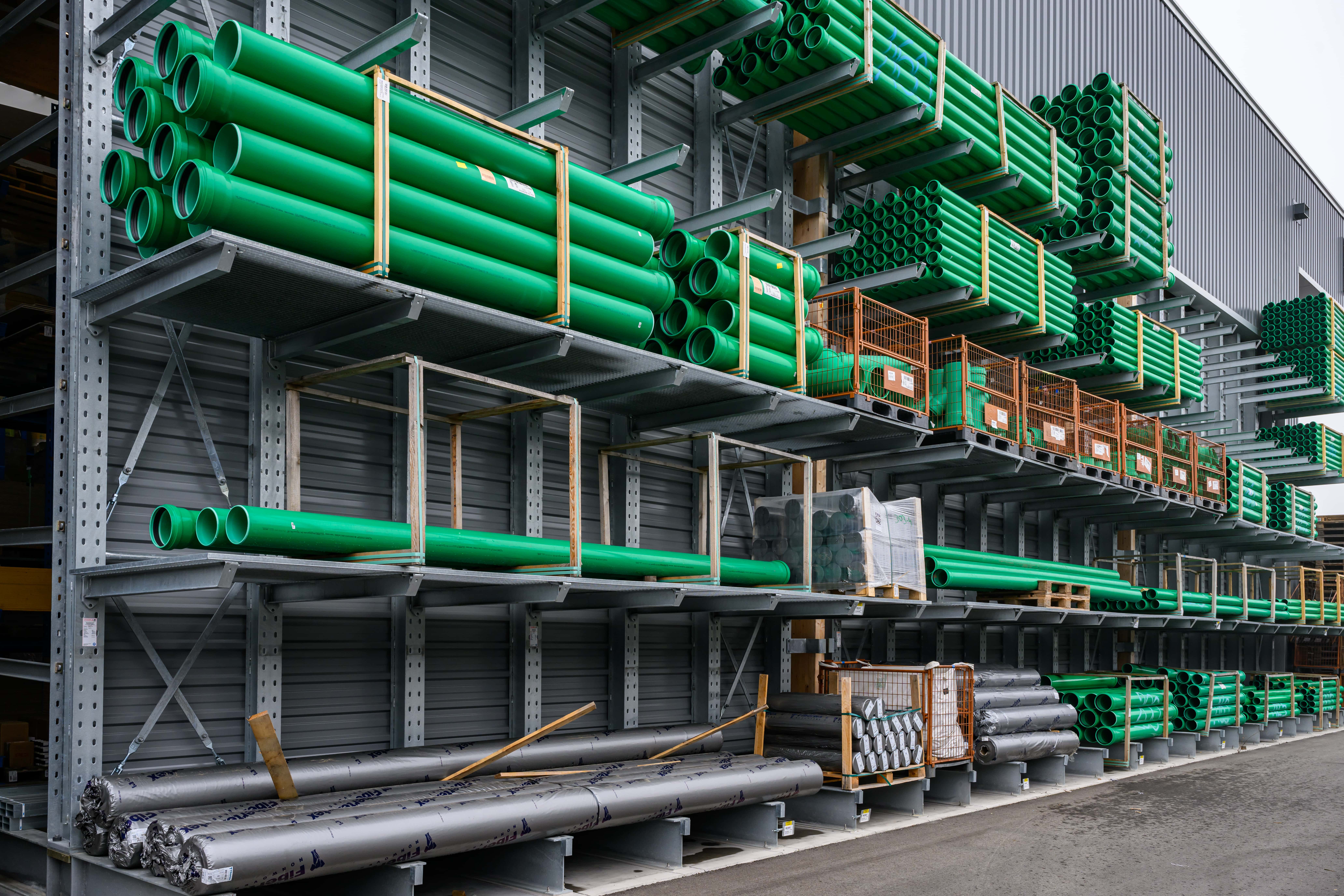 Aufgrund der unterschiedlichen Materialien rüstete OHRA die Lagerbereiche sowohl mit Kragarm- als auch mit Palettenregalen aus. Insgesamt 22 Regale, einfach- und doppeltief und mit einer Höhe von bis zu 7.500 Millimetern wurden installiert. Jedes Regal ist hinsichtlich Tragfähigkeit, Anzahl der Lagerebenen und Zubehör individuell für die verschiedenen Waren konfiguriert. Während die Regale für den Innenbereich in Wunschfarbe lackiert wurden, sind die Außenregale verzinkt und damit vor Witterungseinflüssen geschützt. Teilweise wurden die Regale mit Auflagerosten bzw. Gitterrosten ausgerüstet, um möglichst flexibel bei der Lagerung unterschiedlich dimensionierter Artikel zu sein. Eine Besonderheit ist zudem das Abschlussregal der Halle: Es wurde so ausgelegt, dass es eine Spundwand zwischen den Achsmaßen aufnehmen kann – es bildet somit die Rückwand des Gebäudes.