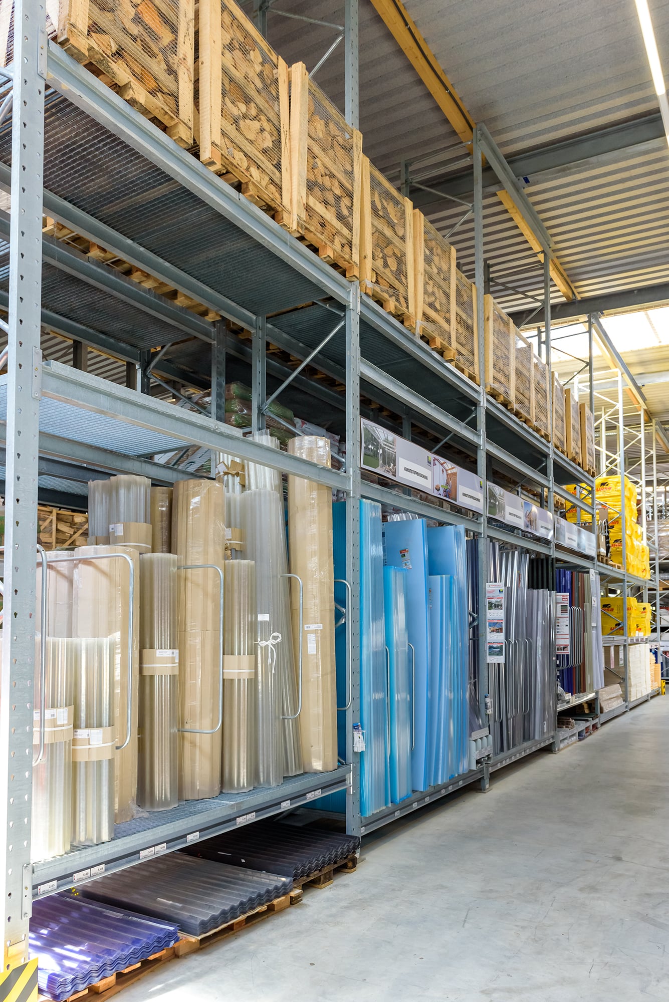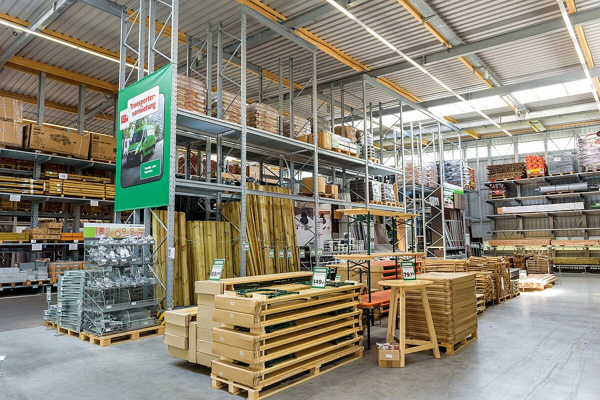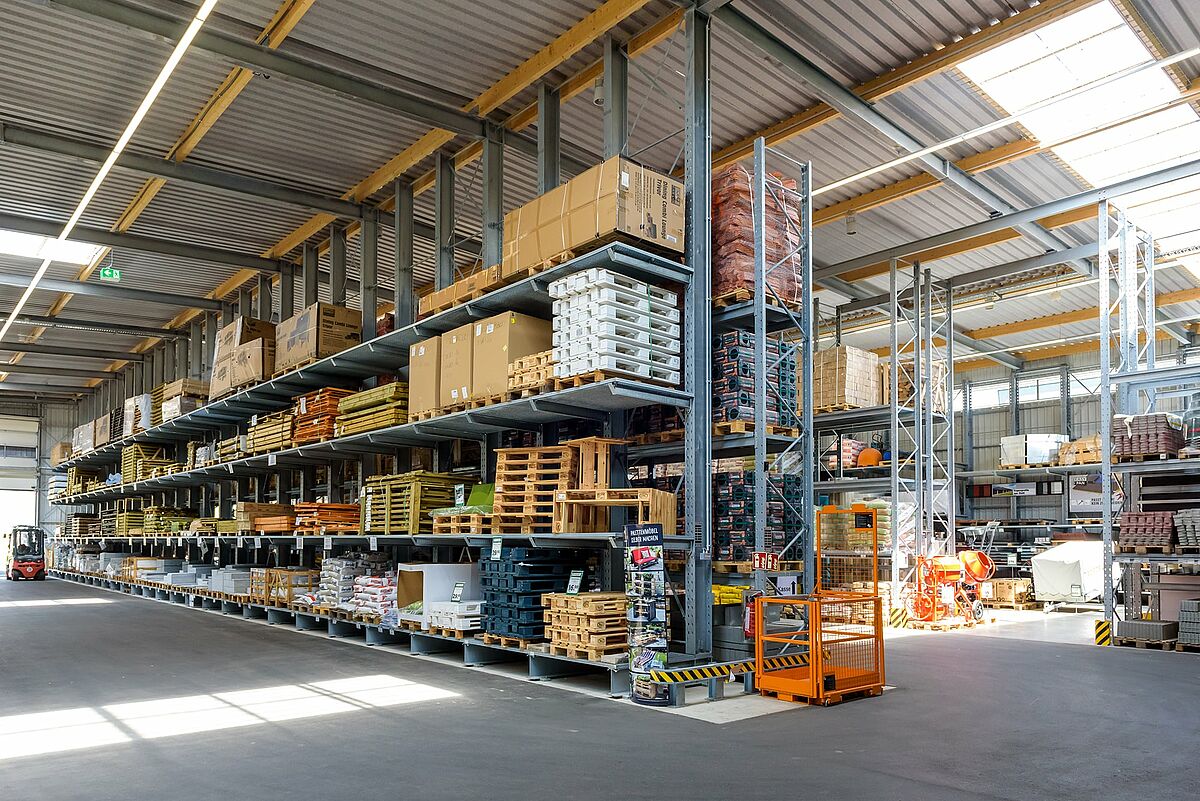 Zur Lagerung der Garten- und Holzartikel entschied sich Jos. Schneider für eine Mischung aus bis zu 48 Meter langen Kragarm- und Palettenregalen. Um eine durchgehende Lagerung verschiedenster Artikel in den Kragarmregalen zu realisieren, wurden alle Lagerebenen mit Gitterrosten ausgestattet. Durch den Einsatz von vollwandigen Stahlprofilen für alle tragenden Elemente erreichen die Regale von OHRA eine hohe Tragkraft, zudem können die Profile bei Stößen elastisch nachgeben und behalten dauerhaft ihre statischen Eigenschaften bei. Damit bieten sie auch eine dauerhafte Basis für Dach und Wände.